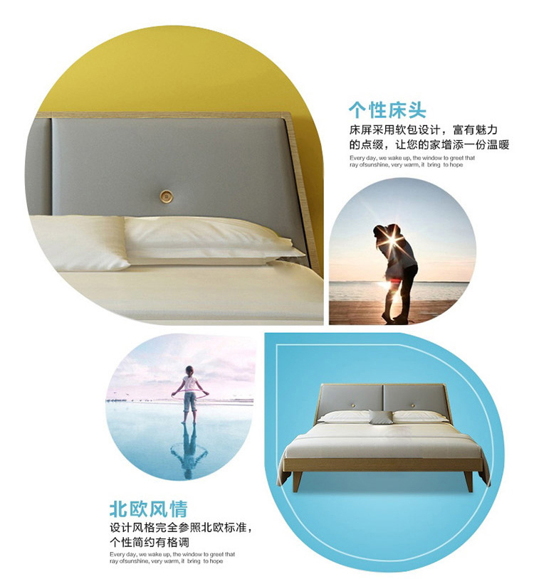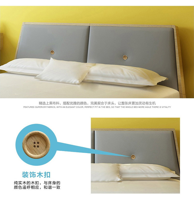 材质: 床屏:夹板+软包(布)床体:夹板 床架:排骨架 脚:实木架(橡木)