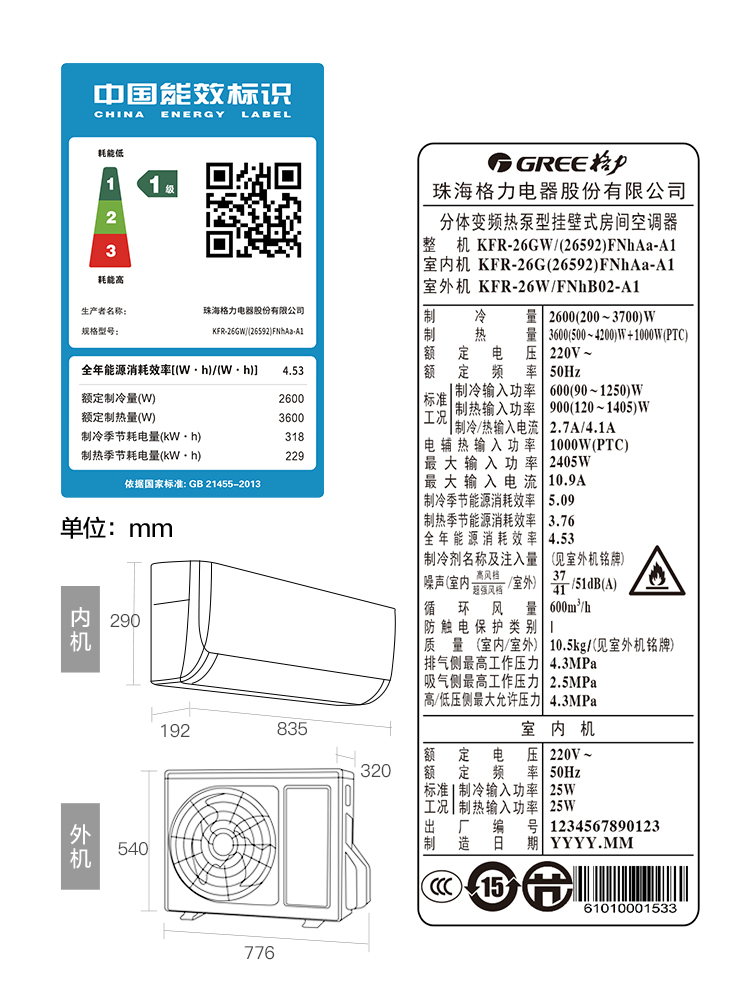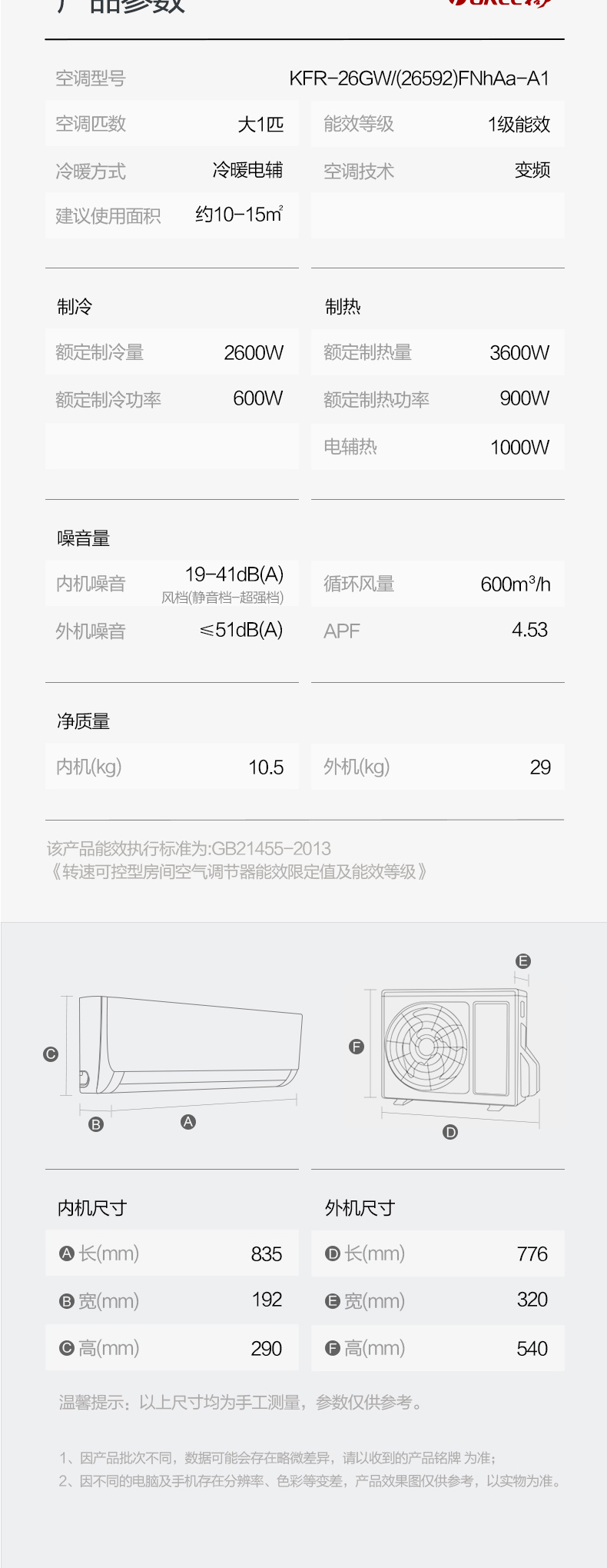 商品名称:格力空调大1p匹一级能效变频挂机冷暖家用节能静音