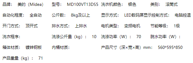 商品名称:美的(Midea)洗衣机全自动滚筒洗烘一体10公斤kg 带烘干变频消毒上排水