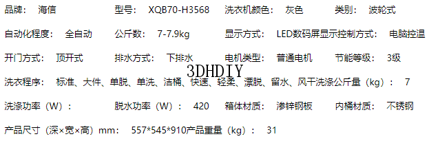 商品名称:【S】Hisense/海信洗衣机 7公斤全自动波轮式