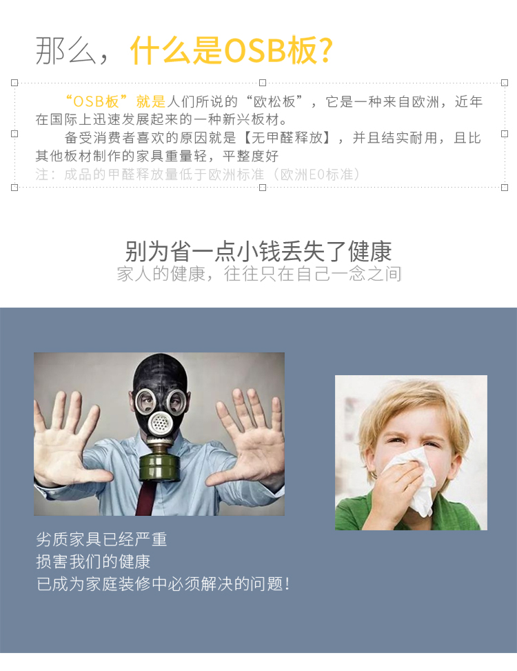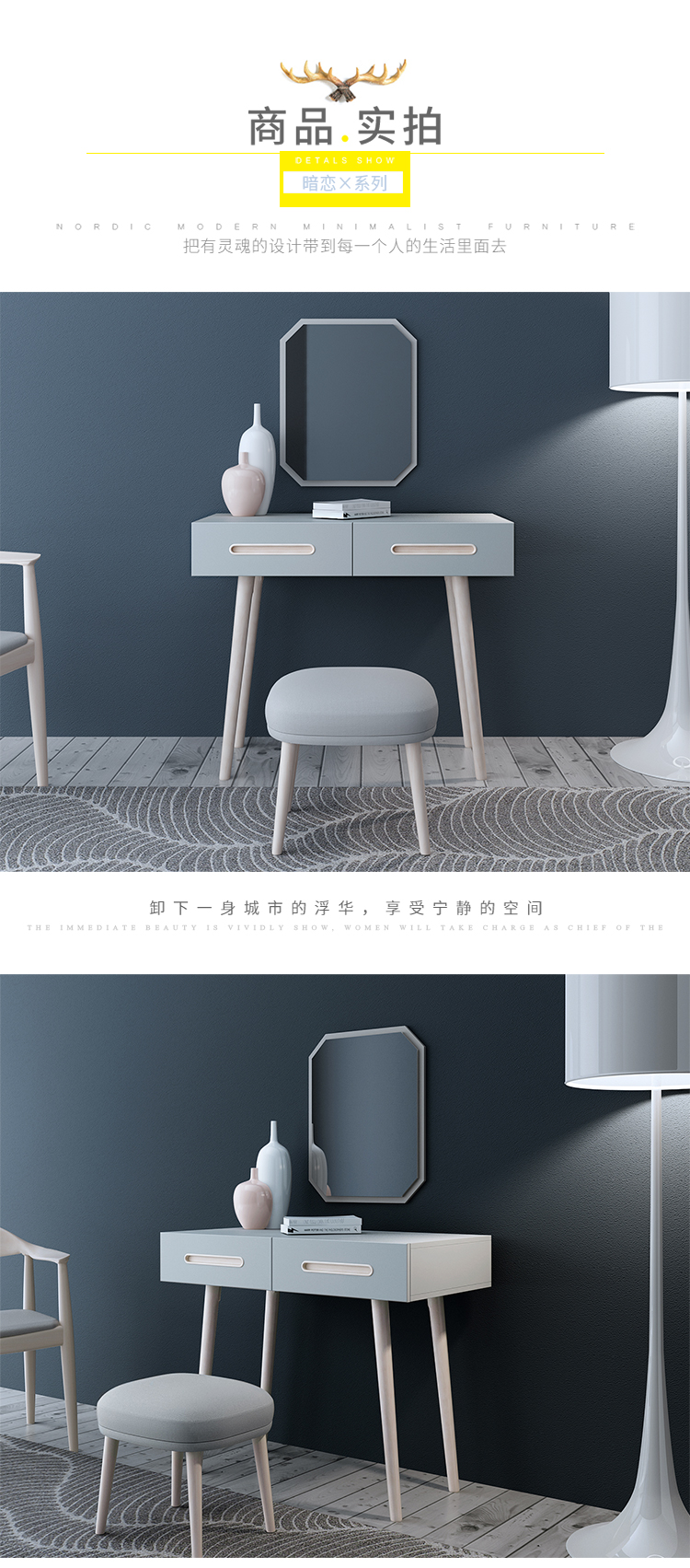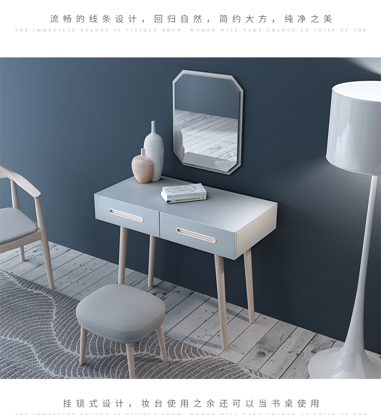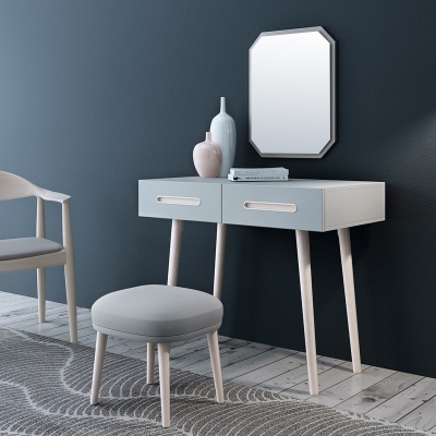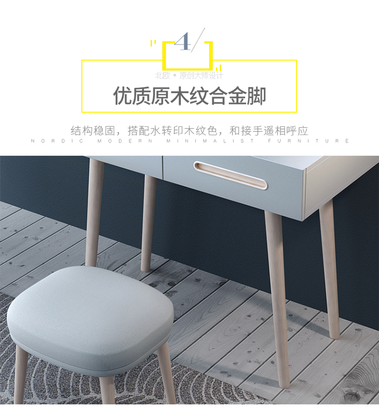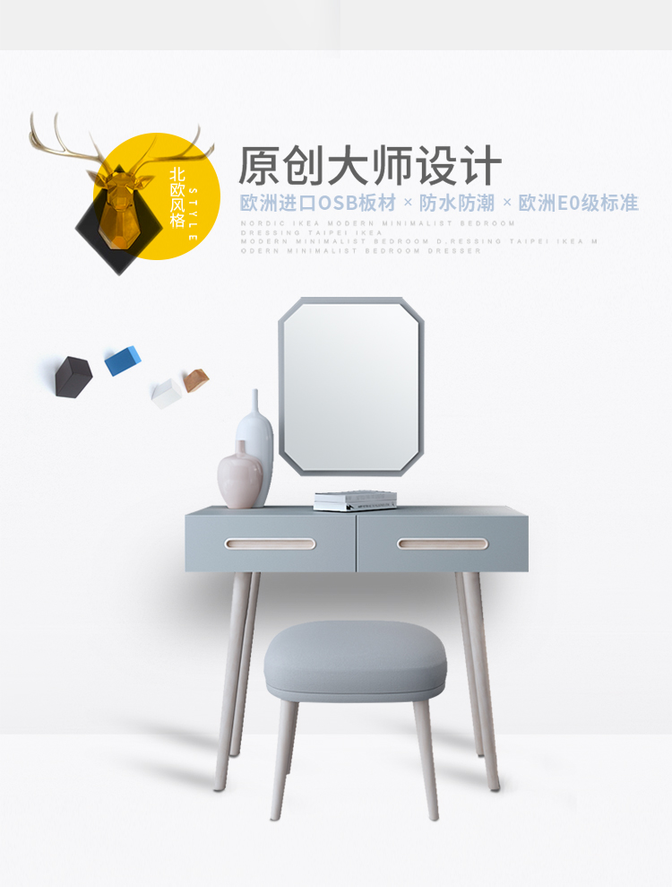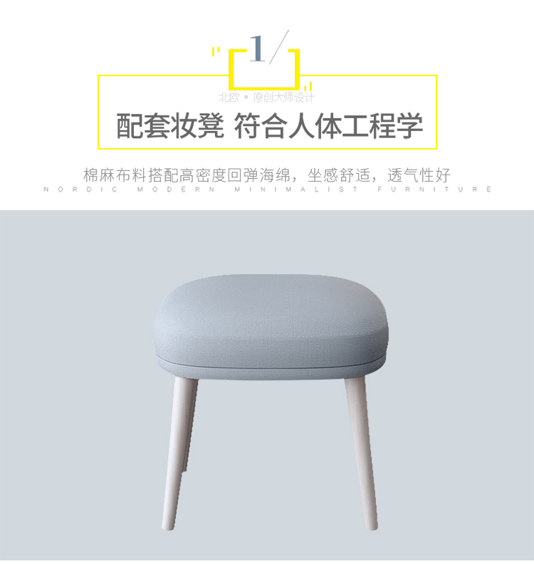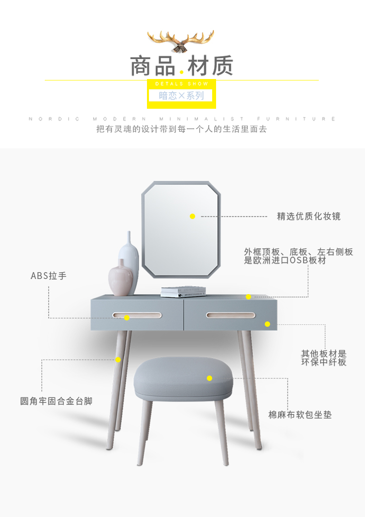 妆台:OSB+中纤板+五金脚, 妆凳:布包+海棉+五金脚