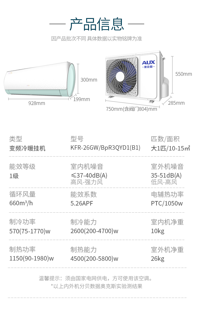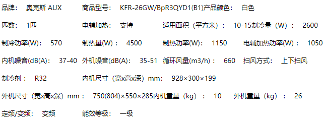 商品名称:(AUX) 奥克斯空调挂机一级能效 1P 变频冷暖 自清洁家用壁挂式空调新能效 大1匹