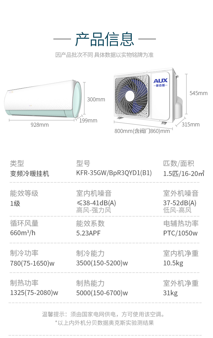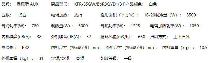 商品名称:(AUX) 奥克斯空调挂机一级能效 1.5P 变频冷暖 自清洁家用壁挂式空调新能效 1.5匹