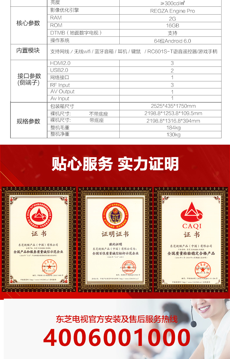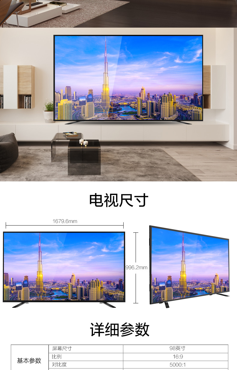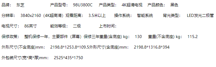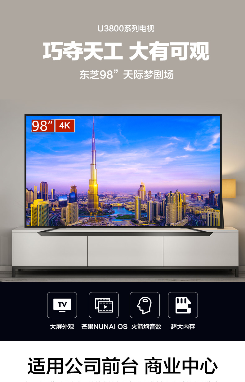 商品名称:【H】东芝(TOSHIBA) 98英寸 家用/别墅/商用大屏巨幕 影院 家用办公两用 4K超高清液晶平板电视机