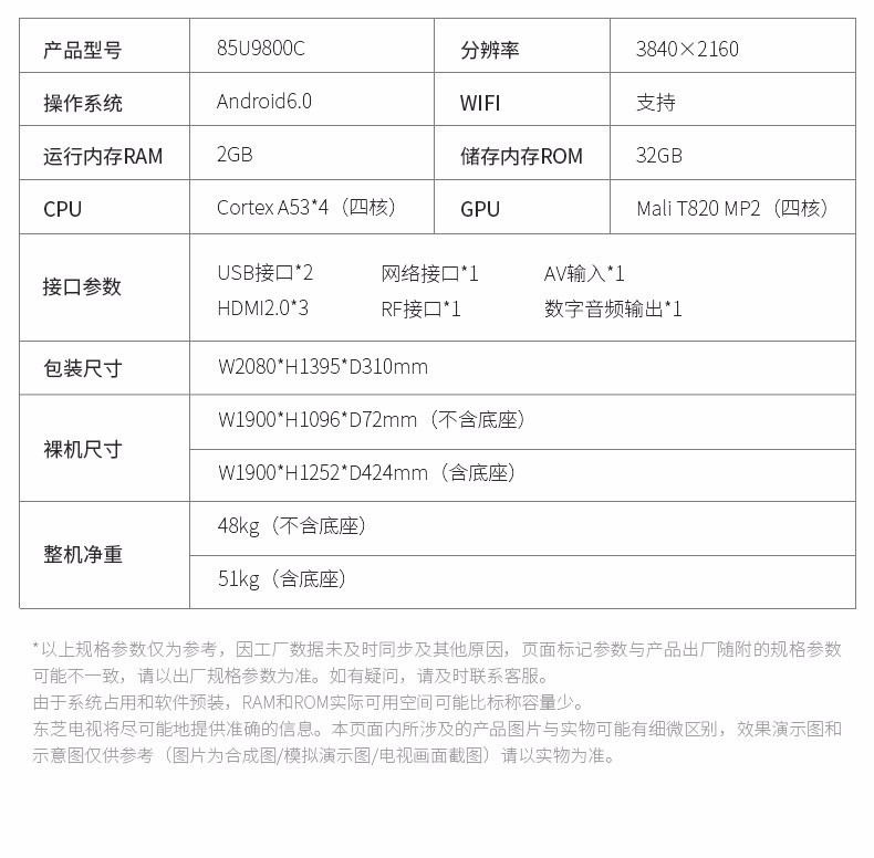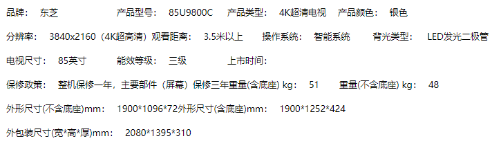 商品名称:【H】东芝(TOSHIBA) 85英寸 商用工程大屏 4K超高清智能LED液晶平板电视机