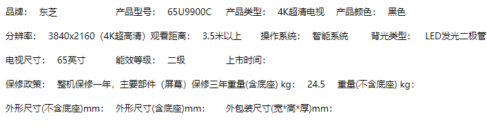 商品名称:【H】东芝(TOSHIBA)65英寸全面屏无边框4K超高清人工智能语音量子点液晶电视机