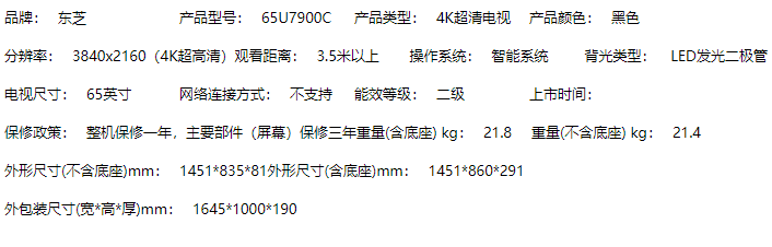 商品名称:【H】东芝(TOSHIBA)65英寸4K超高清彩电 人工智能全面屏平板电视机 二级能效