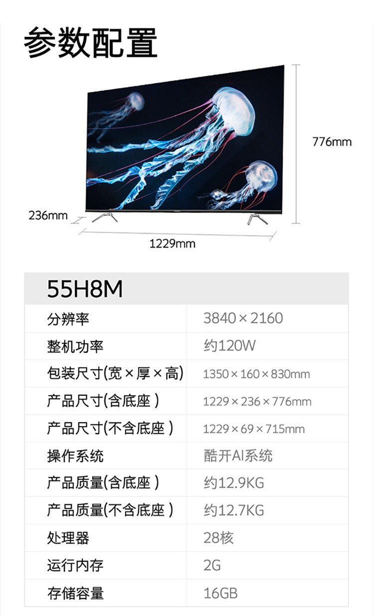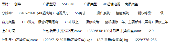 商品名称:【H】创维电视(Skyworth) 55英寸 4K超高清 超薄全面屏 人工智能HDR LED电视