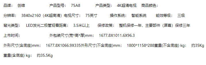 商品名称:H】创维电视(SKYWORTH) 75英寸4K超高清 金属窄边超大屏 人工智能语音 前置音响 蓝牙网络WIFI 液晶平板电视机