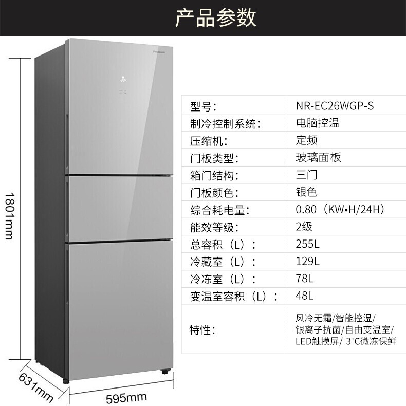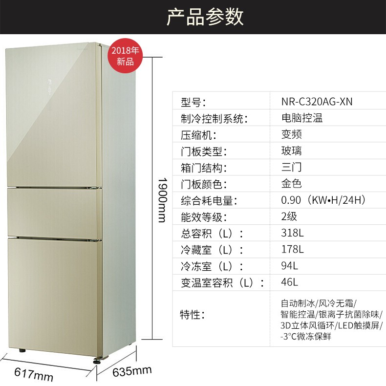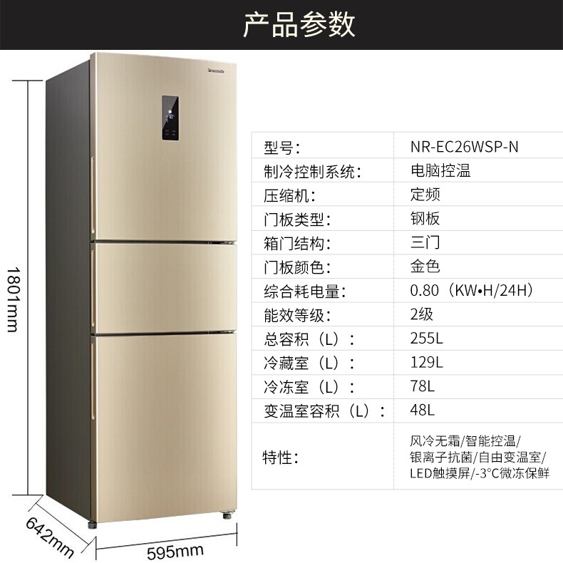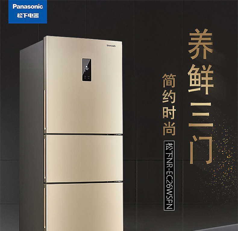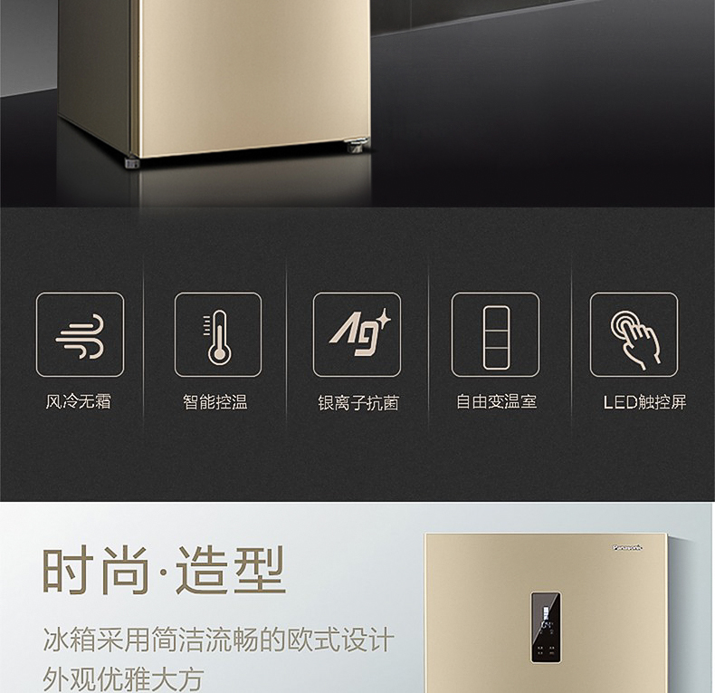 商品名称:松下(Panasonic) 三门风冷无霜家用冰箱全国联保 (金色318L)玻璃面板