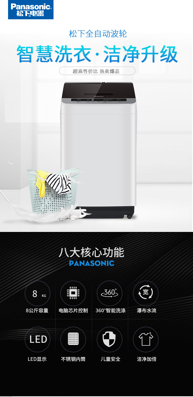 商品名称:松下(Panasonic) 8公斤全自动洗衣机波轮洗衣机爱妻号家用大容量智慧洗宽瀑布水流