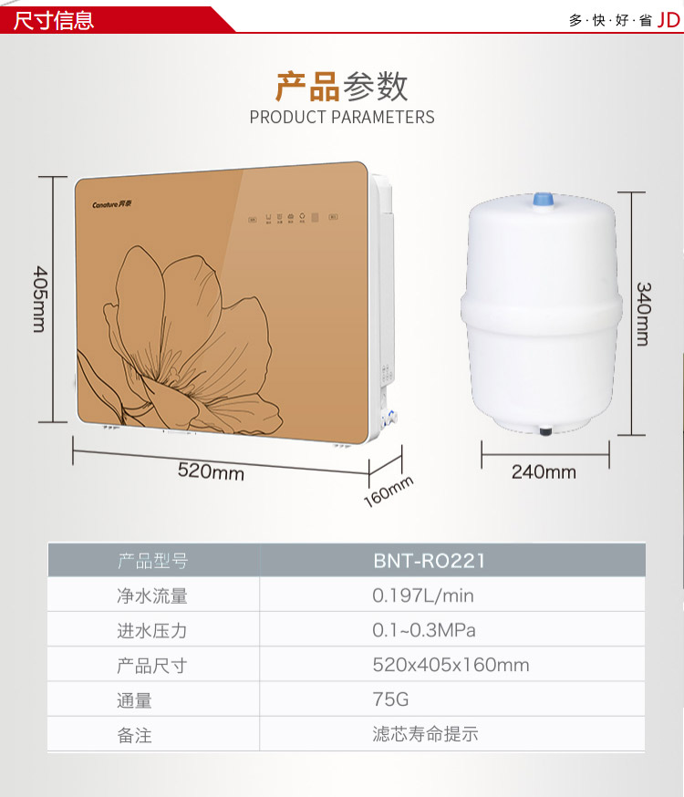 商品名称:开能奔泰(Canature)净水器家用反渗透纯水机家用厨房直饮机自来水过滤器净水机BNT-RO221 五级过滤 滤除重金属