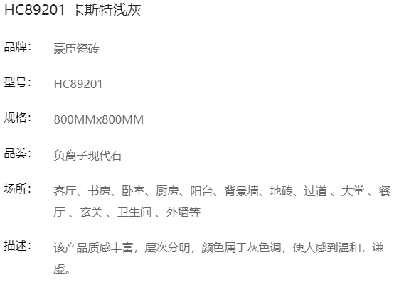 商品名称:豪臣负离子瓷砖 800*800 卡斯特浅灰