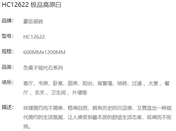商品名称:豪臣负离子瓷砖600*1200 极品高原白