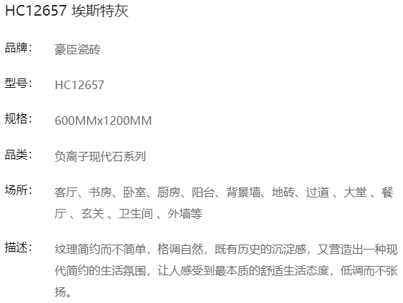 商品名称:豪臣负离子瓷砖600*1200 埃斯特灰