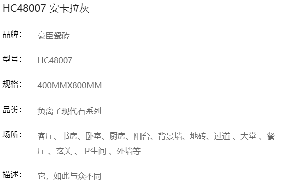 商品名称:豪臣负离子瓷砖 400*800 安卡拉灰