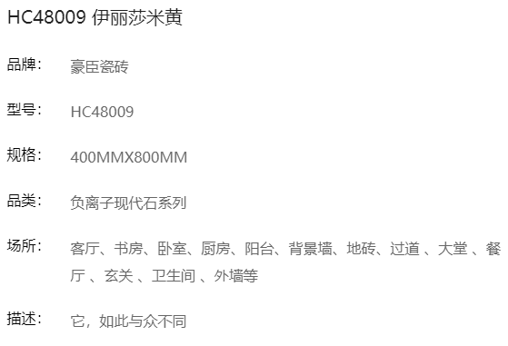 商品名称:豪臣负离子瓷砖 400*800 伊丽莎米黄