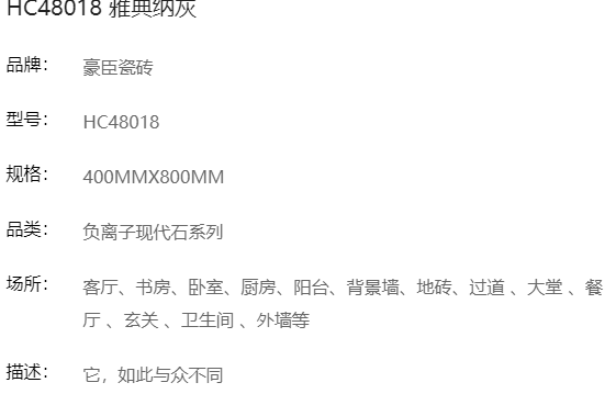商品名称:豪臣负离子瓷砖 400*800 雅典纳灰