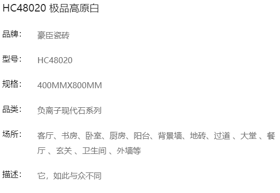 商品名称:豪臣负离子瓷砖 400*800 极品高原白