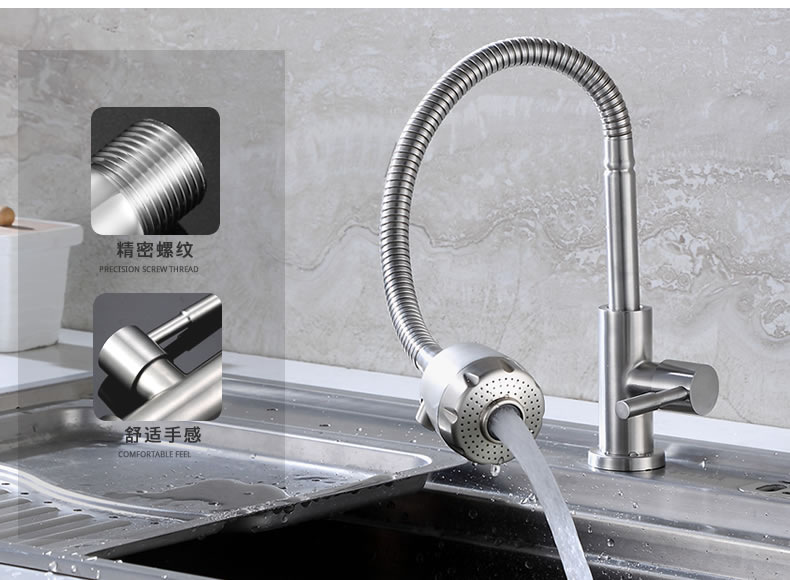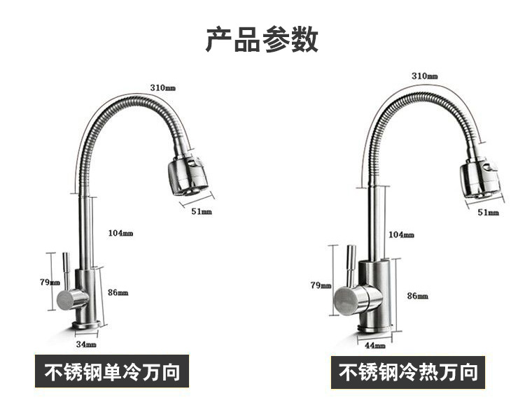 功能类别:混水龙头 货号:WX025681 型号:单冷热万向 安装型式:坐式 材质:不锈钢 阀座直径:35-40 工作温度:10-90 公称压力:0.8 进出水管直径:4分口 适用类型:厨房龙头 结构形式:单联式