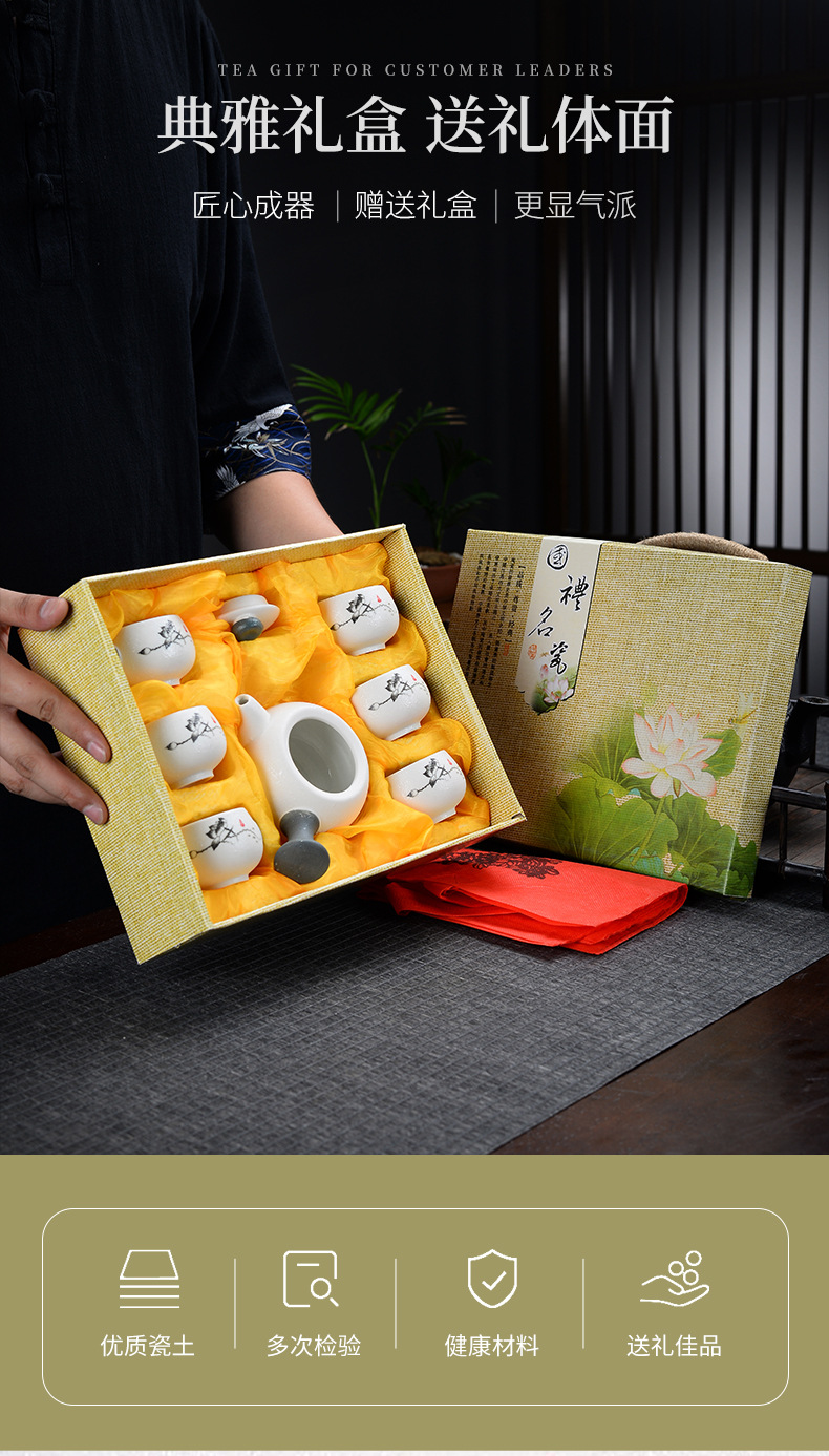 产品类别:茶具套装 是否进口:否 货号:CJ-GFCJ-001-XHY 材质:陶瓷 陶瓷分类:白瓷 规格:一壶六杯含礼盒