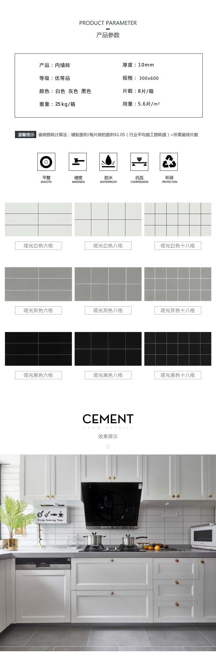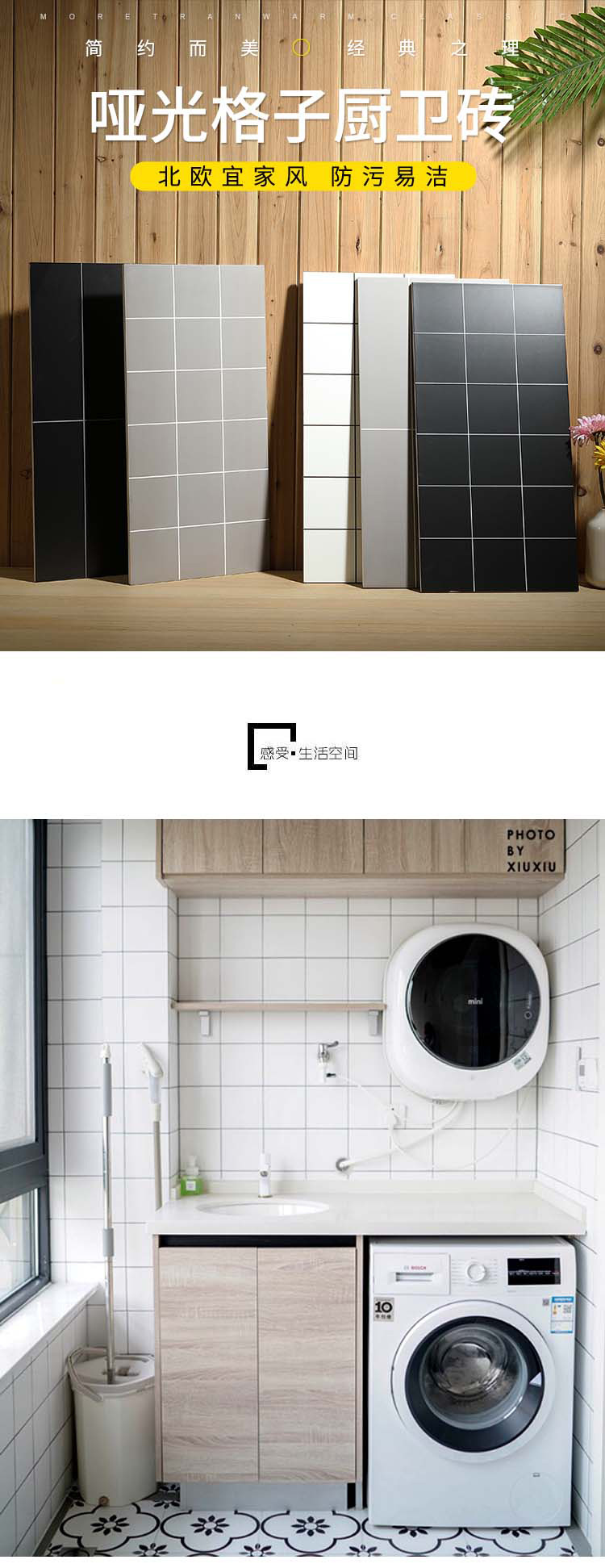 北欧内墙砖小白砖卫生间墙砖300600厨房阳台瓷砖黑白格子面包砖